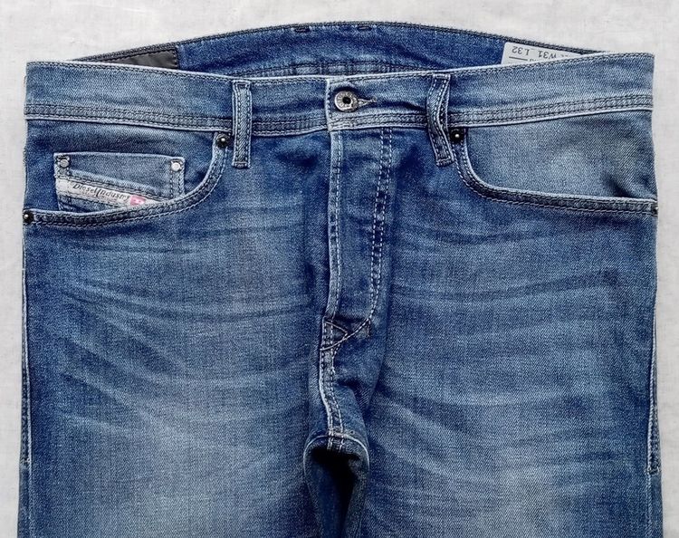 กางเกงยีนส์ DIESEL …รุ่น TEPPHAR / ทรง SLIM… ผ้าฝ้ายผสม elastane (เนื้อผ้ายืดขยายได้เล็กน้อย) ขัดฟอกสี สำหรับผู้ชาย เอวจริง 35 นิ้ว เป้า 11 นิ้ว ต้นขา 10.2 นิ้ว ขาใน 32.5 นิ้ว ขายาวรวม 41.5 นิ้ว ปลายขา 6.3 นิ้ว ของแท้ สภาพใหม่ (มาพร้อม QC STICKER) ปลายขาเดิม made in Morocco