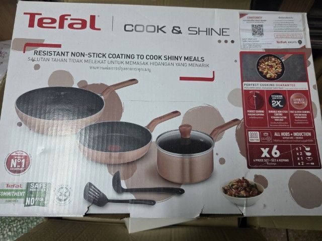 สินค้าประกอบด้วย 1. กระทะก้นลึก จํานวน 1 ชิ้น 2. กระทะก้นตื้น จํานวน 1 ชิ้น 3. หม้อด้ามจับ จํานวน 1 ชิ้น 4. ฝาแก้ว 1 ชิ้น 5. ตะหลิว จํานวน 1 ชิ้น 6. กระบวย จํานวน 1 ชิ้น