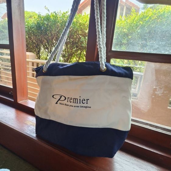 กระเป๋าในภาพคือ กระเป๋าผ้าแคนวาส (Canvas Tote Bag) ดีไซน์แบบตัดต่อสองสี (Two-tone) โดยมีลักษณะเด่นดังนี้ครับ:วัสดุ: ผลิตจากผ้าแคนวาส ซึ่งมีความหนา ทนทาน และรับน้ำหนักได้ดีดีไซน์: เป็นทรงสี่เหลี่ยมผืนผ้าแนวนอน มีการตัดต่อสีขาวและสีน้ำเงินกรมท่า พร้อมสายสะพายไหล่แบบเชือกถักสีขาวที่ให้ลุคสไตล์ทะเล (Nautical Style)รายละเอียด: ด้านหน้าสกรีนข้อความ "Premier" พร้อมสโลแกน "More than you ever imagine" ซึ่งมักเป็นสินค้าพรีเมียม